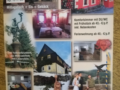 Just 200 meters away is Lauenstein Castle, where daily falconry shows (closed on Mondays) take place, as well as the Ore Mountains Museum inviting exploration. Furthermore, you can have lunch at the "Falknerstüb'l" or enjoy delicious homemade cakes and ice cream.