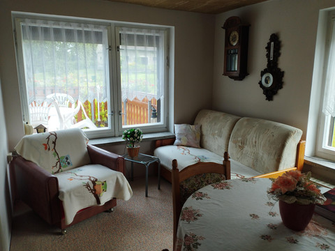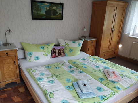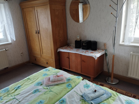 Would you like to get to know our beautiful Upper Lusatia? The holiday apartment is located in a half-timbered house in Upper Lusatia, quietly and sunny. Rental is possible for 1-4 people (additional bedding in the living room for the 3rd and 4th person). The 43 m² non-smoking apartment consists of 1 living room with sofa bed, 1 bedroom, 1 small kitchen, shower/WC, balcony, garden, and playground. Welcome drink, daily newspaper, towels, bed linen, and final cleaning are included.
