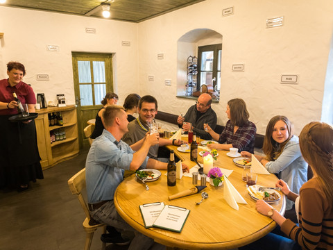 Cuciniamo stagionalmente con prodotti provenienti principalmente dai Monti Metalliferi e dalla Sassonia. Potrete dissetarvi con succhi di frutta locali, acqua di roccia di Scheibenberg o birra Karzl, disponibile solo nel nostro Leffelstub'.Tutti i piatti serviti sono da considerarsi di qualità.