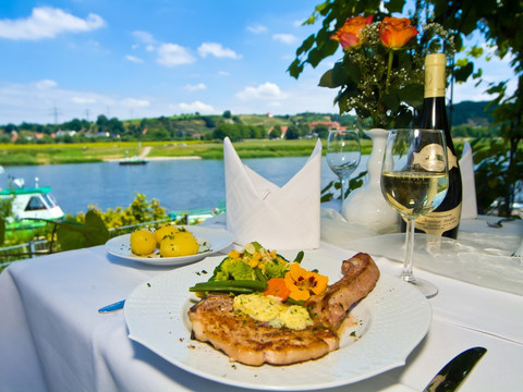The Obstblütenweg is the shortest connection from Lommatzsch to the Elbe cycle path in Niederlommatzsch. From Lommatzscher Markt, the cycle route leads along Meißner Straße in the direction of Zehren to the end of the town. Turn left here following the cycle path signs. You have reached Ochsenstraße, a historic street. Unfortunately, the quality of the path is very poor over 2.5 km and it is to be hoped that this water-bound surface with many gravel areas and depressions will be renovated as soon as possible. This ox road leads through the wide landscape of the Lommatzscher Pflege to Wölkisch. Here you cross the B6 federal highway and take the road to the old smithy in Oberlommatzsch. Cross the village in the direction of Naundorf. Before reaching the village, turn left onto the hiking trail at the reservoir. You soon reach the asphalt road and Niederlommatzsch. The route descends steeply to the right down to the Elbe cycle path. This is reached at the Landgasthof Elbklause with the Radhaus accommodation and the ferry.